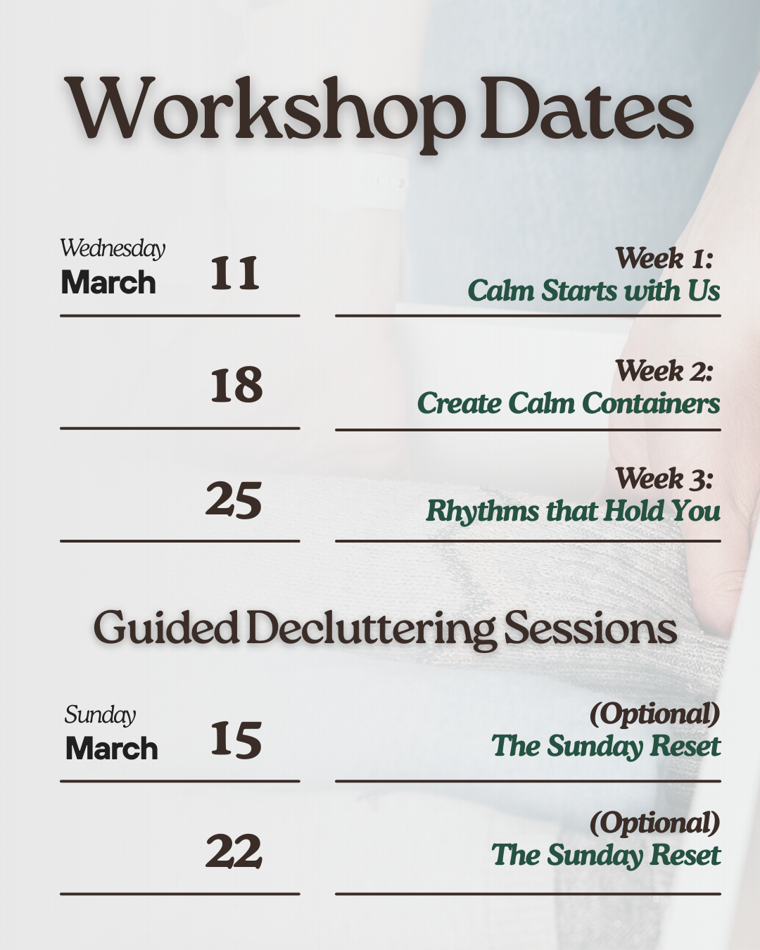 Understand how clutter impacts your nervous system and family functioningIdentify where visual and emotional friction is draining youCreate one calmer “container” in your own spaceShift from urgency to renewalReduce decision fatigueBegin delegating from steadiness instead of frustration